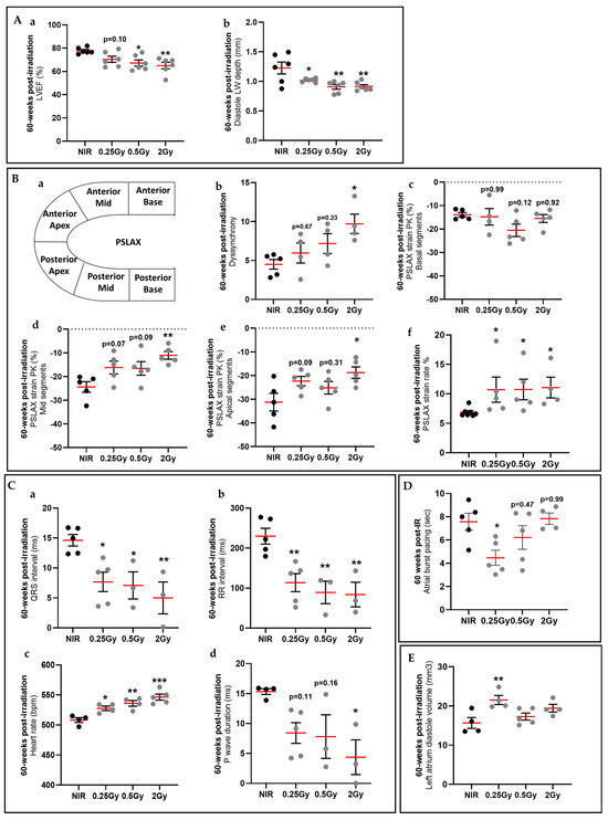 2.1. Effects of Top-Heart X-ray Irradiation on Atrial and Ventricular Cardiac Function in Mice 60 Weeks Post-IR