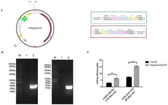 In the second strategy, we constructed all twinPE components—PE protein, pegRNA1, and pegRNA2—on the same plasmid. This plasmid provided an integrated twinPE system and included an EGFP detection marker for transfected cells. As such, this construct improved the transfection probability of the twinPE system into the same cell, with only one plasmid bearing all required components, and improved the detection efficiency of prime editing without the need for positive cell enrichment. The results indicated that the integrated twinPE editing efficiency was significantly improved and achieved 2.19-fold at FANCF 456–591 and 2.11-fold at CCR5 3027–3126. Based on these results, we speculated that integrated twinPE might have higher efficiency in hard-to-transfect cell lines.