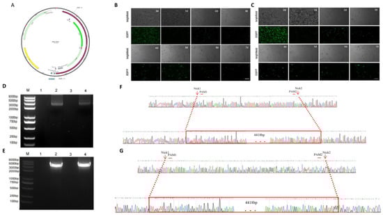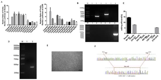 Three days after transfection, cells were washed with PBS and lysed with trypsin (Gibco, NY, USA), after which genomic DNA was extracted with a Genomic DNA kit (Tiangen, Beijing, China). Genomic DNA was amplified with PCR primers and revealed with agarose gel electrophoresis. For junction PCR, edited cells which were revealed objective stripe while WT cells were not. The objective stripe was purified and cloned in pMD19T for subsequent Sanger sequencing.