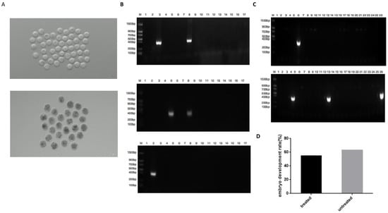 Then, 400 parthenogenetic activation embryos were divided into two groups. Group 1 was microinjected with 200 ng/µL PE2 mRNA, 50 ng/µL pegRNA1, and 50 ng/µL pegRNA2 and group 2 was microinjected with 400 ng/µL PE2 mRNA, 100 ng/µL pegRNA1, and 100 ng/µL pegRNA2. After 5 days of cultivation at 38.5 °C in a humidified incubator with 5% CO2, 42 morulas of group 1 and 59 morulas of group 2 were collected, each embryo was cracked individually, and twinPE efficiency was detected with junction PCR.