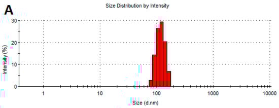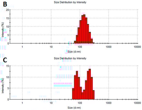 Size distribution of the NPs: (A)—AgNPs, (B)—AuNPs, and (C)—CuNPs.