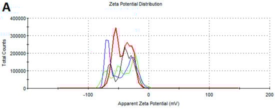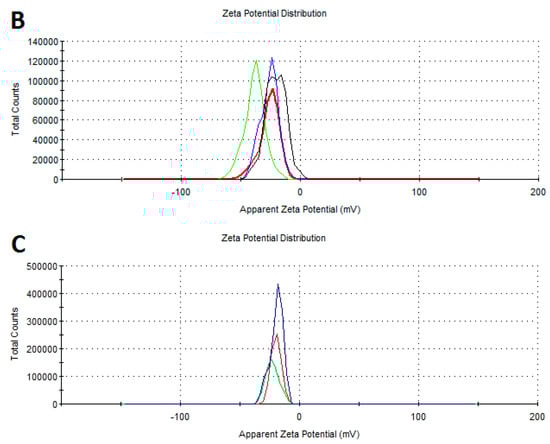 Zeta potential distribution of the NPs: (A)—AgNPs, (B)—AuNPs, and (C)—CuNPs.
