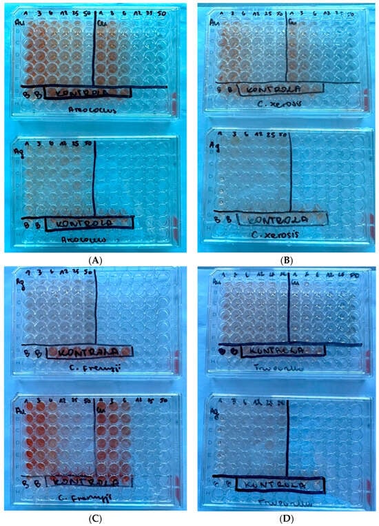 Results of the XTT assay for each examined strain: (A) Aerococcus viridans, (B) Corynebacterium xerosis, (C) Corynebacterium freneyi, and (D) Trueperella pyogenes.