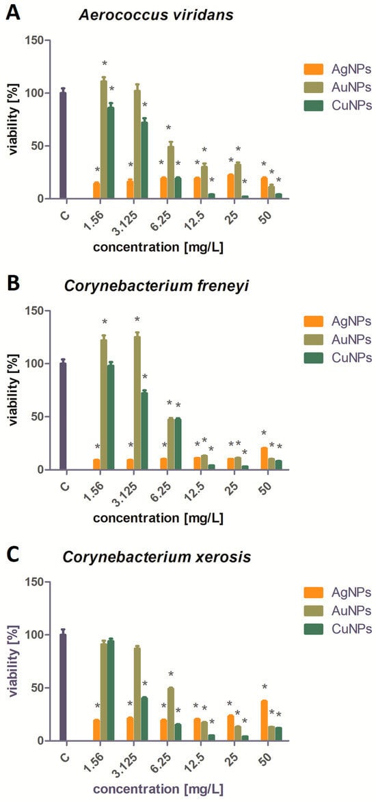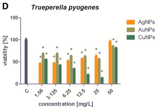 Viability analysis of the tested pathogens treated with Ag, Au, and Cu NPs (%): (A)—Aerococcus viridans, (B)—Corynebacterium freneyi, (C)—Corynebacterium xerosis, and (D)—Trueperella pyogenes. * Significant differences in comparison to control (p < 0.05).