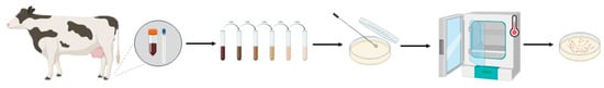 Swabs, pus and tissue samples were collected during hoof correction (standard zootechnical procedure) from the limbs of cattle diagnosed with lameness and placed in sterile boxes and transported to a laboratory at the Department of Animal Breeding of the Warsaw University of Life Sciences, as presented in Figure 6. The collected samples were placed in sterile 0.9% NaCl at eight dilutions up to 10−8 in order to prepare inoculations. Bacteria cultures were cultivated using Columbia Blood Agar with 5% KB (Biomaxima, Lublin, Poland) under aerobic and anaerobic conditions at 37 °C for 24–72 h. In order to create the anaerobic culture conditions for the microbiological cultures, GENbag (bioMérieux, Warsaw, Poland) microorganism identification was performed using a MALDI-TOF mass spectrometer (MS) (Bruker, Poznań, Poland), which enables the identification of bacteria using mass spectrometry and is based on the m/z ratio of ions in the tested sample to the ratio in the NCBI (National Center for Biotechnology Information) database. Each NCBI strain has a unique number connected to a specific strain.