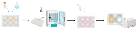 A bacterial viability test was carried out according to the diagram in Figure 7. Bacterial suspensions with an optical density of 0.5 on the McFarland scale were prepared with sterile 0.9% NaCl. The groups for the 50 mg/L bacterial concentration were prepared separately. The suspensions were pipetted into a 96-well plate at a volume of 50 μL per well. Nanoparticle hydrocolloids were sonicated for three minutes and then applied to the plate at 50 μL per well. The concentrations of NPs in the wells were as follows: 50, 25, 12.5, 6.25, 3.125, and 1.56 mg/L. The bacteria were incubated for 24 h at 37 °C. After 24 h, 20 μL of XTT reagent (Sigma-Aldrich Cell Proliferation Kit II, Merck, Darmstadt, Germany) was added to each well. The bacteria were incubated for the next 24 h at 37 °C and then the absorbance was read using an Infinite M200 microplate reader (Tecan, Morrisville, NC, USA) at a wavelength of 450 nm and a reference of 690 nm.