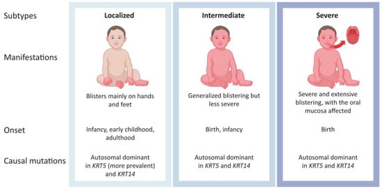 Epidermolysis bullosa simplex (EBS) affects the skin, a vital organ with a dynamic and complex organization protecting the body from stress conditions [,]. Most cases of EBS result from autosomal dominant mutations affecting either keratin 5 (KRT5) or KRT14 []. Under normal conditions, the corresponding proteins, keratin 5 (K5) and 14 (K14), form heterodimers assembling together into intermediate filaments (IFs) []. In EBS, causal mutations can impact the structure of these proteins, causing keratin aggregates in keratinocytes, triggering endoplasmic reticulum stress and leading to the release of pro-inflammatory molecules []. Intraepidermal ruptures occur and lead to loss of tissue integrity and severe blistering of the epidermis upon mechanical trauma or traction [,,,]. A schematic representation of the structural impairments leading to EBS symptoms can be visualized by Li et al. []. The keratin defects in EBS also trigger itching, causing further discomfort while also yielding new lesions by scratching the skin and, thus, promoting inflammation [,]. The severity of EBS is highly variable with three main clinical subtypes: localized EBS (EBS-loc), intermediate EBS (EBS-intermed), and severe EBS (EBS-sev) [,]. Figure 1 represents the characteristics of these different subtypes. Rare subtypes of EBS exist, for which other causal mutations were identified in several genes (plectin (PLEC), Kelch-like member 24 (KLHL24), dystonin (DST), exophilin-5 (EXPH5), and CD151 molecule (CD151)) [,].