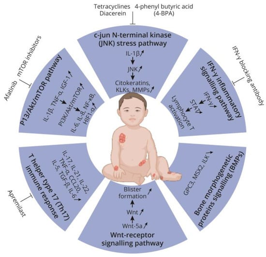 The skin abnormalities in EBS are associated with inflammation and immune reaction via the production of chemokines and cytokines. This indicates possible therapeutic perspectives for decreasing chronic inflammation. Figure 2 offers an overview of key inflammatory pathways in EBS, identified in Section 2 of the present review, and the associated therapeutic approaches discussed below.