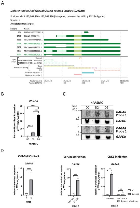 DAGAR characterization. (A) Scheme of DAGAR locus and annotated variants: qPCR primers and Northern blot probes are aligned below. Light green depicts the area with greater conservation between species. In yellow are depicted the regions obtained and sequenced with high confidence in cloning experiments. MICT00000249498.1 corresponds to DAGAR-1 and MICT00000249499.1 to DAGAR-2. nt = nucleotides; qPCR = quantitative Polymerase Chain Reaction (B) Expression of DAGAR during hPASMC differentiation by RT-qPCR (n = 3). Data were analyzed using two-tailed one-way ANOVA on Log(2) transformation of relative normalized expression. p values displayed account for Tukey multiple-comparison post hoc test. (C) Northern blot of DAGAR, with GAPDH as loading control. (D) DAGAR expression in cell-cycle-arrested fibroblast (left panel) after induction of quiescence by cell-to-cell contact (n = 5; data were analyzed using two-tailed Student t-test on Log(2) transformation of relative normalized expression), (middle panel) in proliferative MRC5 cells after serum starvation for 48 h compared with normal growth medium (n = 3, analyzed using a two-tailed Student t-test on Log(2) transformation of relative normalized expression), and (right panel) after reversible CDK1 inhibition with 10 μM of Ro3306 treatment for 24 h (n = 2) and after additional 24 h of recovery following inhibitor withdrawal (n = 2, analyzed using a two-tailed Student t-test with Welch’s correction on Log(2) transformation of relative normalized expression). Same volume of DMSO was used as vehicle control for Ro3306 treatment. MRC5 P = cells at 70% confluency. MRC5 C = cells 48 h after reaching full confluency. hPASMC = Human Pulmonary Artery Smooth Muscle Cell. D0 = Cells at 70% Confluency. D2 = Cells at full confluency. D6 = Cells 96 h after reaching full confluency. ** p < 0.01, *** p < 0.001, and **** p < 0.0001.