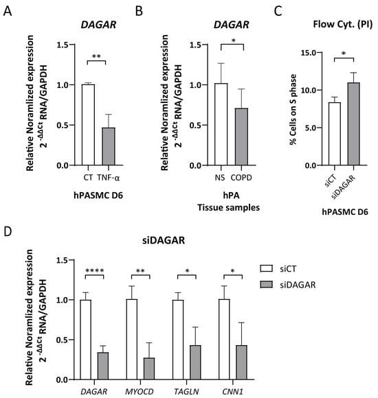 The cytokine TNFα has been recognized as an inducer of SMC phenotypic modulation [,] and is involved in the inflammatory pathway activating the proliferation of SMCs and fibroblasts in both COPD and PH. Taking this into consideration, we tested whether treatment with TNFα modulates DAGAR expression. Remarkably, we found that a 48 h treatment with TNFα was sufficient to downregulate DAGAR expression in SMCs at D6 to approximately half of the control levels (Figure 2A). Given DAGAR modulation after TNFα treatment, and a similar regulation for SMCs and fibroblasts during quiescence, we wondered whether COPD patients would display a similar change. To this end, we measured its expression in total RNA extracted from human pulmonary arteries of patients with COPD compared to non-smoking control patients (NS). This retrospective analysis was performed on samples from the study conducted by Musri et al. [] and employed RT-qPCR for characterization. Our findings showed a significant downregulation of DAGAR in pulmonary arteries from COPD patients when compared to non-smoker patients (NS) (Figure 2B), similar in relative change to that observed after TNFα treatment on SMCs. These results suggest a potential correlation between the downregulation of DAGAR and the pathological states of SMCs and/or adventitial fibroblasts in these patients.