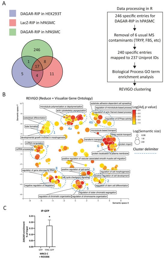 Mass spectrometry analysis of DAGAR RNA pulldown (DAGAR-RIP). (A) Left panel: Venn diagram on proteins identified from mass spectrometry data on control samples (LacZ-RIP on hPASMCs and DAGAR-RIP on HEK293T cells) and specific samples (DAGAR-RIP on hPASMCs). Right panel: Data curation, Uniprot mapping, and Gene Ontology enrichment analysis for biological processes using clusterProfiler within the R environment followed by semantic reduction using REVIGO platform. Additionally, Reactome Pathway enrichment analysis was performed (Figure S3) using ReactomePA within the R environment. (B) REVIGO semantic space reduction of significantly enriched Gene Ontology terms of biological processes and manual cluster delimitation (blue). (C) TFRC-DAGAR interaction cross-validation on confluent MRC5 cells transfected with plasmid expressing either GFP-TFRC or GFPalone and induced for 24 h with 10 μM of Ro3306 for maximum DAGAR expression. GFP-pulldown using an anti-GFP followed by RT-qPCR (n = 3; data were analyzed using one sample t-test on DAGAR percentage of input recovery after pulldown). * p < 0.05.