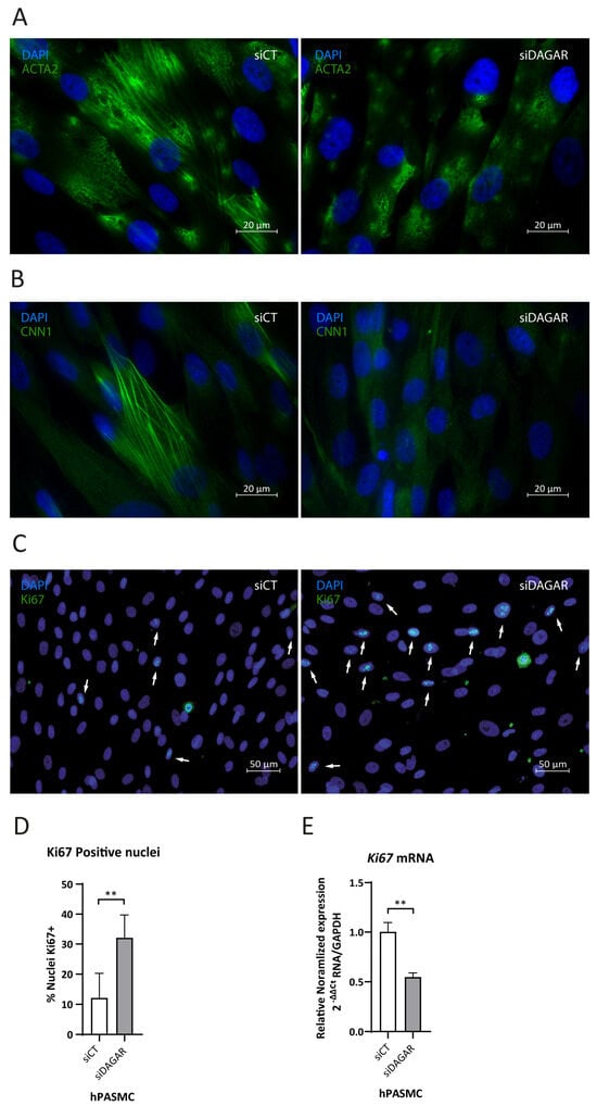 A noteworthy observation was that the top enriched Reactome pathway for DAGAR interactors was “Rho-GTPase regulation” (Figure S3), a pathway that has been shown to play a crucial role in cytoskeleton dynamics [,]. This aligns with the Biological Processes observed in clusters 4a and 4b of significantly enriched GO terms (Figure 3B) Given the importance of cytoskeletal assembly for proper contractility function in smooth muscle, we assessed the impact of DAGAR knockdown on SMC contractile cytoskeleton maturation. We analyzed ACTA2 and CNN1 fiber formation by immunofluorescence and found that DAGAR knockdown hinders ACTA2 (Figure 4A) and CNN1 assembly (Figure 4B). Additionally, in our RNA-IP mass spec data, we found a direct interaction of DAGAR with the proliferation marker Ki67. To address this interesting observation, and taking into account that DAGAR silencing promotes an increase in the percentage of cells on the S phase, we analyzed Ki67 expression after the silencing of DAGAR by immunofluorescence and qPCR (Figure 4C–E). Surprisingly, the observed phenotype was a significant increase in the percentage of Ki67-positive nuclei after knockdown despite a reduction in Ki67 mRNA. Although this observation requires further investigation, the data suggest that the interaction of DAGAR with Ki67 leads to its protein downregulation at the translational or post-translational level.