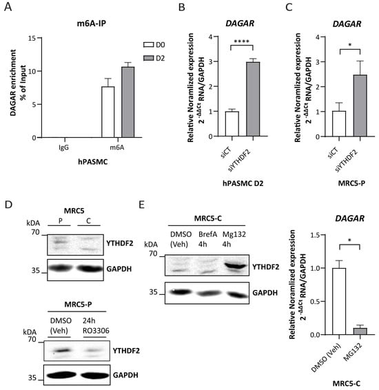 DAGAR regulation by the YTHDF2/m6A axis. (A) m6A immunoprecipitation from total RNA derived from hPASMCs at D0 and D2 with anti-IgG as control. (B) DAGAR expression after silencing YTHDF2 m6A reader (siYTHDF2) compared to scrambled siPOOL control (siCT) in hPASMC measured by RT-qPCR (n = 3; data were analyzed using two-tailed Student t-test on log(2) transformation of the normalized relative expression). (C) DAGAR expression after silencing YTHDF2 reader (siYTHDF2) compared to scrambled siPOOL control (siCT) in proliferative MRC5 cells measured by RT-qPCR (n = 3; data were analyzed using two-tailed Student t-test on log(2) transformation of the normalized relative expression). (D) Western blot of YTHDF2 in confluent MRC5 cells (MRC5 C) compared to proliferative MRC5 cells (MRC5 P) (upper panel); Western blot of YTHDF2 after Ro3306-induced cell cycle exit in proliferative MRC5 cells (MRC5-P 24 h Ro3306) compared to DMSO (vehicle)-treated proliferative MRC5 cells (MRC5-P DMSO veh) (lower panel). GAPDH was used as loading control. (E) DAGAR expression after YTHDF2 recovery. Western blot of YTHDF2 after proteasome inhibition using MG132 treatment (MG132 4 h); retrograde transport inhibition by Brefeldin A treatment (BrefA 4 h) or DMSO (vehicle) treatment (DMSO veh) (right panel); DAGAR expression measured by RT-qPCR in MRC5 confluent cells after proteasome inhibition using MG132 treatment compared to DMSO vehicle control condition (left panel) (n = 2, analyzed using Student t-test on log(2) transformation of normalized relative expression). * p < 0.05, **** p < 0.0001.