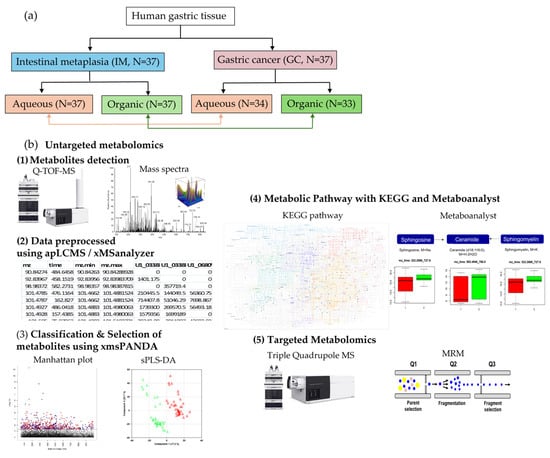 We enrolled 37 patients and collected two GC tissue samples and two corresponding IM tissue samples from each patient, investigating the aqueous and organic metabolites obtained from these tissues (Figure 1a). The cancer location, stage, pathological differentiation, and Lauren classification were used to obtain detailed information on the participants. Based on the American Joint Committee on Cancer Tumor-Node-Metastasis (TNM) system, 15 patients with stage I, 7 with stage II, 4 with stage III, and 11 with stage IV were included in this study. The history of Helicobacter pylori infection and family history of GC were also considered. Table 1 shows the characteristics of patients with GC.