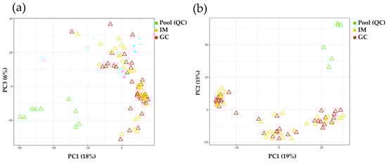 Analytical performance evaluation by comparing pool and case samples. (a) PCA using 665 significant features (FDR q ≤ 0.05) from aqueous extraction data. (b) PCA using 278 significant features (FDR q ≤ 0.05) from organic extraction data. FDR, false discovery rate; GC, gastric cancer; IM, intestinal metaplasia; PCA, principal component analysis; PC1, principal component 1; PC2, principal component 2; PC3, principal component 3; QC, quality control.