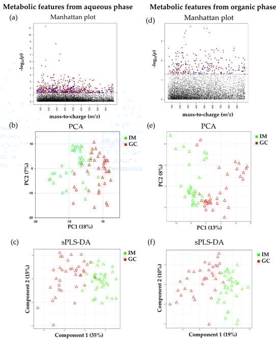 Manhattan plot, PCA, and sPLS-DA between IM and GC. The Manhattan plot presents the significant features (FDR q ≤ 0.05) as colored dots, while their distribution is expressed in m/z. (a) Manhattan plot showing 665 significant features (FDR q ≤ 0.05) derived from the aqueous data. (d) Manhattan plot with 278 significant features (FDR q ≤ 0.05) derived from the organic data. PCA shows the separation of samples: (b) aqueous data and (e) organic data. sPLS-DA shows the separation of samples: (c) aqueous data and (f) organic data. PCA, principal component analysis; PC1, principal component 1; PC2, principal component 2, sPLS-DA, sparse partial least squares discriminant analysis.