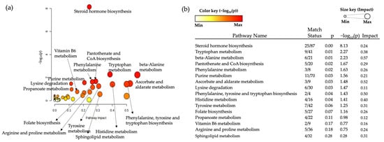 Overview of the pathway analysis of the significant metabolites extracted from the combined aqueous and organic phases. (a) The bubble plot shows the pathways by impact (x-axis) and −log10(p) (y-axis). The color and size of each bubble represent the −log10(p) and impact, represented as color and size keys, respectively. (b) The top 16 pathways based on the −log10(p) are listed alongside their match status, indicating the hit metabolites to whole metabolites involved in each pathway, p-value, and impact.