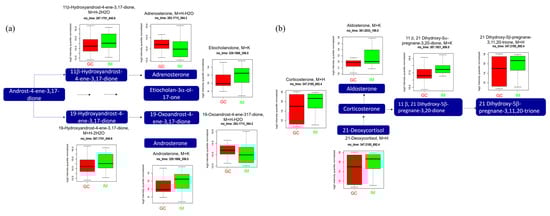 Analysis of significantly altered metabolites between GC and IM in the steroid hormone biosynthesis pathway from the KEGG pathway. (a) Pathway of androgen steroid and (b) pathway of mineralocorticoid. All metabolites in the figure a and b were significantly altered (FDR, q ≤ 0.05). Boxplots illustrate the upper quartile, median (dashed bar), and lower quartile, with whiskers indicating the maximum and minimum values. FDR, false discovery rate; GC, gastric cancer; IM, intestinal metaplasia; KEGG, Kyoto Encyclopedia of Genes and Genomes.