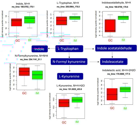 In tryptophan metabolism (Figure 6), the levels of L-tryptophan (m/z: 205.0964, [M+H]+) and its metabolic derivatives, including indole (m/z: 188.0702, [M+H]+), indole acetaldehyde (m/z: 160.0750, [M+H]+), N-formyl kynurenine (m/z: 254.1141, [M+NH4]+), indoleacetate (m/z: 170.0600, [M+H]+), and L-kynurenine (m/z: 191.0820, [M+H]+) were significantly altered. N-formylkynurenine was significantly higher in the GC group than in the IM group, while those of indole, L-tryptophan, indole acetaldehyde, indoleacetate, and L-kynurenine were significantly lower in the GC group than in the IM group.