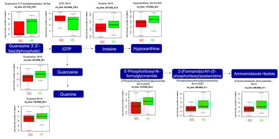 In purine metabolism (Figure 7), the expression levels of guanosine 3′,5′-bis(diphosphate) (m/z: 437.3722, [M+Na]+) and its metabolic derivatives (including guanosine triphosphate (GTP) (m/z: 523.9958, [M+H]+), inosine (m/z: 307.0433, [M+K]+), hypoxanthine (m/z: 119.0350, [M+H-Htyl0]+), guanosine (m/z: 322.0538, [M+K]+), and guanine (m/z: 152.0580, [M+H]+)) and 5′-phosphoribosyl-N-formylglycinamide (m/z: 279.0390, [M+H-2H20]+) and its metabolic derivatives (including 2-(formamido)-N1-(5′-phosphoribosyl)acetamidine (m/z: 296.0659, [M+H-H20]+) and aminoimidazole ribotide (m/z: 296.0659, [M+H]+)) were significantly altered. The expression level of GTP was significantly higher in the GC group than in the IM group, while those of guanosine 3′,5′-bis(diphosphate), inosine, hypoxanthine, guanosine, guanine, 5′-Phosphoribosyl-N-formylglycinamide, 2-(formamido)-N1-(5′-phosphoribosyl)acetamidine, and aminoimidazole ribotide were significantly lower in the GC group than in the IM group.