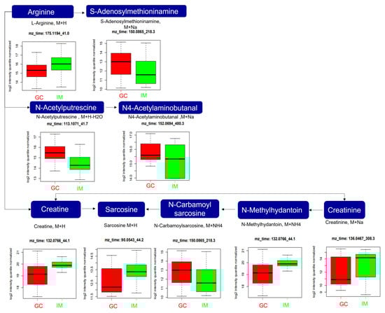 In arginine and proline metabolism (Figure 8), the expression levels of S-adenosylmethioninamine (m/z: 150.0865, [M+Na]+), N-acetylputrescine (m/z: 113.1071, [M+H-H2O]+), N4-acetylaminobutanal (m/z: 152.0694, [M+Na]+), and N-carbamoyl sarcosine (m/z: 150.0865, [M+NH4]+) were significantly higher in the GC group than in the IM group, while those of arginine (m/z: 175.1194, [M+H]+), creatine (m/z: 132.0766, [M+H]+), sarcosine (m/z: 90.0543, [M+H]+), N-methylhydantoin (m/z:, [M+NH4]+), and creatinine (m/z: 136.0467, [M+Na]+) were significantly lower in GC than in the GC group than in the IM group.
