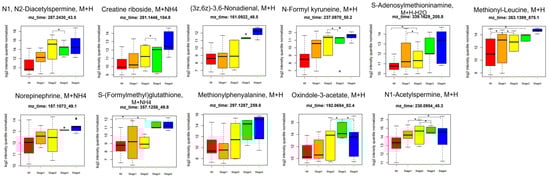 Figure 9 shows the significantly altered metabolite intensities according to stage. The significance of all metabolites was calculated by the analysis of variance (ANOVA) with a Tukey post hoc test (p ≤ 0.05), using GraphPad Prism. The expression levels of 11 metabolites, including N1, N2-diacetylspermine (m/z: 287.2430, [M+H]+), creatine riboside (m/z: 281.1446, [M+NH4]+), (3z,6z)-3,6-nonadienal (m/z: 161.0922, [M+H]+), N-formyl kynurenine (m/z: 237.0870, [M+H]+), S-adenosylmethioninamine (m/z: 339.1629, [M+H-H2O]+), methionyl-leucine (m/z: 263.1399, [M+H]+), norepinephrine (m/z: 187.1073, [M+NH4]+), S-(formylmethyl)glutathione (m/z: 357.1258, [M+NH4]+), methionylphenylalanine (m/z: 297.1287, [M+H]+), oxindole-3-acetate (m/z: 192.0654, [M+H]+), and N1-acetylspermine (m/z: 230.0954, [M+H]+), significantly increased according to stage.