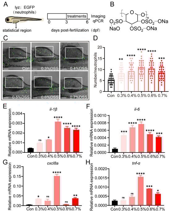 DSS promotes the recruitment of neutrophils and the expression of pro-inflammatory cytokines. (A) Tg(lyz:EGFP) zebrafish larvae (3 dpf) were exposed to different concentrations of DSS for three days. (B) Images display the chemical formula of DSS. (C) Images demonstrate the recruitment of neutrophils in the zebrafish intestinal injury model under fluorescence microscopy. White rectangles represent counting areas. Scale: 100 μm. (D) Shows the statistical quantification of neutrophil recruitment in the zebrafish intestinal injury model under control group and different concentrations of DSS treatment. The recruitment of neutrophils in the zebrafish intestine increases to varying degrees with different concentrations of DSS treatment. (E–H) Display the gene expression levels of pro-inflammatory cytokines il-1, il-6, cxcl8a, and tnf-α in zebrafish under control group and different DSS concentrations. The levels of pro-inflammatory cytokines in zebrafish increase to varying degrees with different concentrations of DSS treatment. All statistical analyses are compared to the control group (Con group). (ns, not significant; * p < 0.05, ** p < 0.01, *** p < 0.001, **** p < 0.0001 one-way ANOVA.)