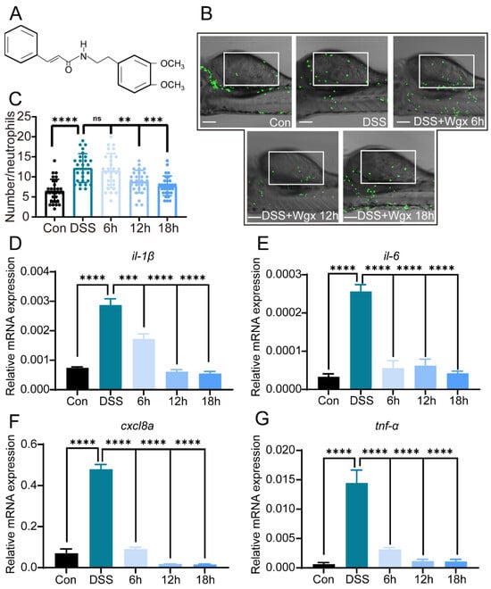 0.5% DSS can significantly induce colitis. To investigate whether Wgx-50 has a regulatory effect on DSS-induced colitis, we treated the samples with 10 µL/L Wgx-50 for 6, 12, and 18 h, respectively (Figure 2A). The results showed that compared to the DSS group, Wgx-50 suppressed the recruitment of neutrophils to the site of intestinal injury (Figure 2B,C). As the treatment time increased, the number of recruited neutrophils gradually decreased. Furthermore, compared to the DSS group, the expression levels of pro-inflammatory cytokines (such as il-1β, il-6, cxcl8a, and tnf-α) were significantly reduced in the Wgx-50 treatment group (Figure 2D–G). The expression levels of cytokines gradually decreased with increasing treatment time, exhibiting a time-dependent reduction. These results indicate that Wgx-50 exerts inhibitory effects on the recruitment of neutrophils and the expression of pro-inflammatory cytokines in the zebrafish colitis model, and this effect is time-dependent, with the most significant effect observed after 12 h of Wgx-50 treatment. Based on this finding, we decided to use a 12 h treatment time for Wgx-50 in the subsequent experiments.