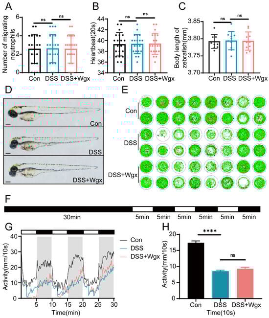 For behavioral analysis, the experiment was divided into control group, DSS-treated group, and Wgx-treated group, with a pre-treatment of 72 h for all groups. Each group consisted of 16 fish and was placed in a 48-well plate. The procedure of the PMR experiment was as follows: a 30 min adaptation to darkness was conducted, followed by alternating 5 min periods of light exposure and darkness, repeated three times. Finally, a 2 min dark interval was included to observe the activity of the larvae [].