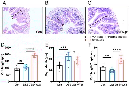 Protective effect of Wgx-50 on intestinal morphology in zebrafish after DSS treatment. (A) H&E staining of control group zebrafish intestinal sections shows normal tissue structure. (B) Zebrafish intestinal sections exposed to DSS show evident tissue inflammation and pathological changes. (C) Zebrafish intestinal sections treated with Wgx show a protective effect. Scale bar: 20 μm. (D–F) Zebrafish intestinal villus length, crypt depth, and the ratio of villus length to crypt depth in the Con, DSS, and DSS + Wgx groups. (ns, not significant; * p < 0.05, ** p < 0.01, *** p < 0.001, **** p < 0.0001, one-way ANOVA.)
