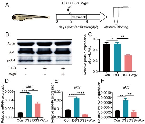 Wgx-50 affects inflammation by regulating Akt expression. (A) Zebrafish larvae (3 dpf) were exposed to DSS or DSS+Wgx on the third day and treated for three days, followed by Western blot analysis. (B,C) Protein expression levels of p-Akt/Akt in control group, DSS group, and DSS + Wgx group are shown. There was no significant change in p-Akt/Akt protein expression levels after DSS treatment, while the protein levels significantly decreased after Wgx treatment. (D–F) Gene expression levels of akt1, akt2, and akt3 in control group, DSS group, and DSS + Wgx group are shown. There was a significant upregulation of akt1, akt2, and akt3 gene expression levels after DSS treatment, while the gene levels significantly decreased after Wgx treatment. (ns, not significant; * p < 0.05, ** p < 0.01, *** p < 0.001, **** p < 0.0001, one-way ANOVA.)