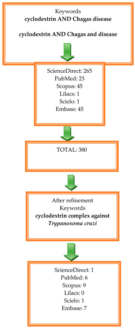 The results of a rigorous filtering process, conducted on the topic of ‘cyclodextrin complexes against Trypanosoma cruzi’ and presented in Figure 1, led to the identification of 24 relevant publications. During the analysis, duplicates were eliminated, considering that some articles were published in different journals. After this step, 13 articles were deemed most pertinent, as detailed in Table 1. These articles provide the foundation for an in-depth discussion of the topic.