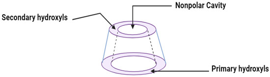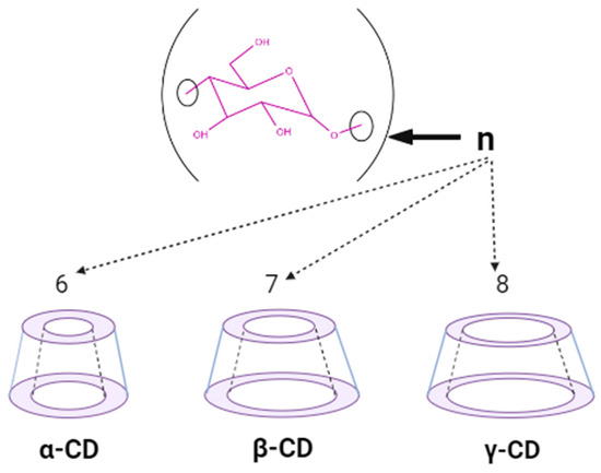 Natural cyclodextrins, specifically α-CDs, β-CDs, and γ-CDs, consist of sets of six, seven, and eight glucose units, respectively (Figure 2). These units are expressed differently, allowing for precise adjustment of both the potency and duration of medication action [18]. As for their synthetic counterparts, they can be categorized into three distinct classes as follows: hydrophilic, represented by 2-hydroxypropyl-β-CD (HP-β-CD); hydrophobic, exemplified by 2,6-di-O-ethyl-β-CD; and ionizable, with sulfobutyl ether β-CD (SBE-β-CD) serving as a prominent example. Cyclodextrin complexes are extensively utilized in pharmaceutical products, drug delivery systems, cosmetics, and various industries and are frequently incorporated into diverse pharmaceutical formulations [20]. Furthermore, they possess notable pharmacological properties, facilitating drug solubility, improving bioavailability, contributing to physicochemical stability, engaging in inclusion complex formation, and enhancing the sensory attributes of drugs, among other roles [23].