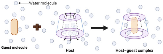 Cyclodextrins have the ability to form inclusion complexes in both liquid and solid media. After this complexation, they can enhance the physicochemical properties of the host substance. Cyclodextrins have the capacity to reduce the volatility of compounds, transform liquids into solids, mask the unpleasant odor and taste of certain compounds, prevent undesirable incompatibilities, improve bioavailability, and reinforce stability, even in the presence of light, heat, and oxidizing conditions. To achieve the formation of inclusion complexes with cyclodextrin, various methods are utilized, as each target substance to be encapsulated has its own particularities. The preparation of these complexes is a relatively simple process. The most common procedure involves agitating or mixing cyclodextrin in an aqueous solution that may vary in temperature (cold or hot) and pH (neutral, alkaline, or acidic), containing the molecules of the guest compound. Inclusion complexes can be acquired through a variety of techniques, including co-precipitation [40,41], co-evaporation [42,43,44,45], lyophilization and physical mixing [46], spray drying and kneading [47], and the use of supercritical fluid technology [48]. In the complexes (Figure 4), the host molecule, i.e., cyclodextrin, partially or entirely houses the guest molecule in its cavity. The formation of this complex is determined by the dimensional characteristics of both the cyclodextrin cavity and the guest molecule.