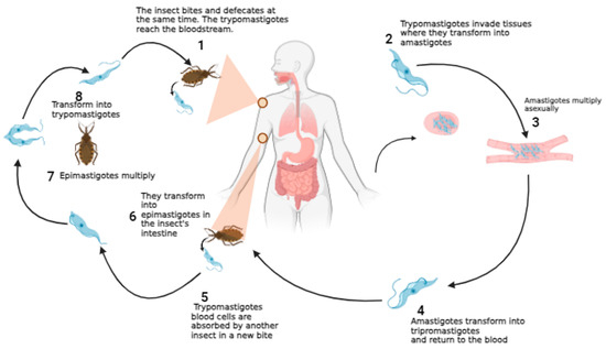 As shown in Figure 5, the biological cycle of T. cruzi begins with the penetration of the trypomastigote forms present in triatomine feces into the intact mucosa or damaged skin of the host after the insect has taken a blood meal. Then, the metacyclic trypomastigote forms penetrate the cells and differentiate into amastigotes. This form multiplies by binary division within the cell and differentiates again into trypomastigotes, which, through the rupture of the parasitized cell, are released into the circulating blood and can again infect another cell or be ingested by the insect. When the triatomine takes a blood meal in hosts infected by T. cruzi, it ingests the trypomastigote form, which in the insect’s midgut differentiates into the epimastigote form of the parasite and multiplies. Then, in the rectal ampulla of the vector, these forms differentiate again into trypomastigotes, which are again capable of infecting new hosts [55,56].