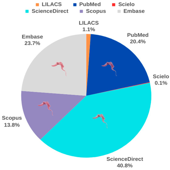 After the acute phase, survivors enter the chronic phase of Chagas disease, often characterized by the absence of visible symptoms, which can persist indefinitely. Over time, patients in this phase may develop symptoms related to the cardiovascular, digestive, or both systems, resulting in cardiac and digestive forms of the disease [61]. Because of the disease’s prevalence in low-income populations, there has been little interest from the pharmaceutical industry in investing in treatments, as they do not represent significant financial returns. The complexity of the disease and limited resources allocated to research in this area has contributed to the scarcity of therapeutic advances over the decades. To date, no new drugs have been developed for the treatment of Chagas disease, as reported by the U.S. Food and Drug Administration. However, academic interest in the topic is significant, especially in public higher education institutions in Latin America [62]. To advance in this scenario, recent research has focused on the treatment of Chagas disease. Over the past five years, our analysis of the scientific literature revealed a total of 2655 studies in PubMed, 19 in Scielo, 144 in LILACS, 3106 in Embase, 5345 in ScienceDirect, and 1806 in Scopus (Figure 7).