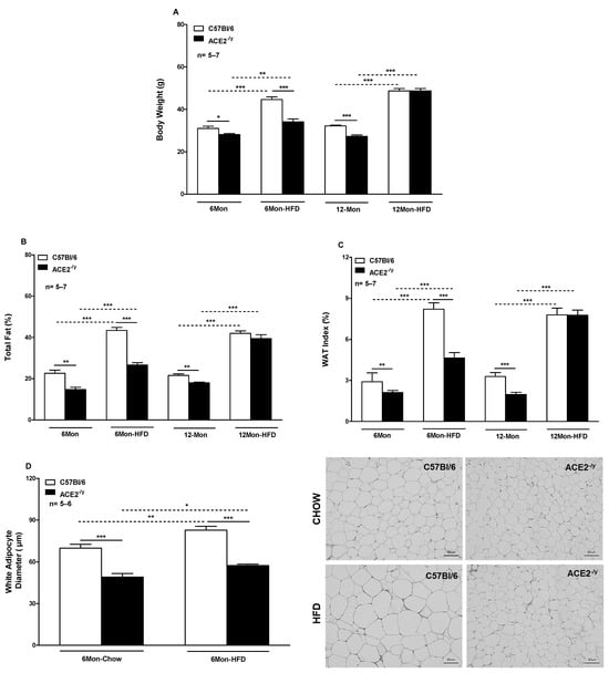 Under StD, ACE2-/y showed a lower BW, total fat, and WAT index at 6 and 12 months of age compared to WT (Figure 1A–C, respectively). These differences were even more pronounced after HFD in 6-month-old mice; however, surprisingly, they disappeared at the age of 12 months. In addition, ACE2-/y displayed a decrease in white adipocyte diameter in 6-month-old mice under both HFD and StD (Figure 1D).