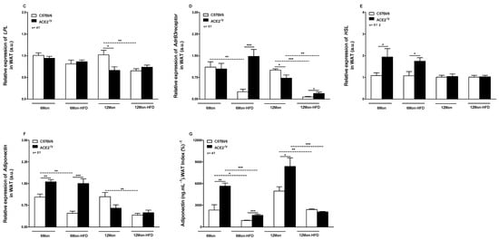 As expected, according to the amount of WAT, ACE2-/y mice presented higher adiponectin and lower leptin levels in plasma, with the same holding true for the gene expression of leptin and adiponectin in WAT compared to WT. These differences were again blunted at the age of 12 months under HFD (Figure 2F–I).