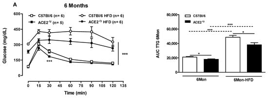Despite the association between advanced age and consumption of HFD, conditions that are already known to favor the onset of metabolic diseases [], the deletion of ACE2 at the age of 12 months did not change BW, fat deposition, or plasma lipid and glucose homeostasis, demonstrating a delayed effect of HFD in ACE2-/y mice, suggesting that ACE2 in an old age no longer interferes with these parameters as observed at younger ages, and that the mechanism of protection against HFD-induced obesity could be age-dependent. In addition to this, since both ACE2 deficiency and obesity have been characterized as an accelerated aging phenotype [], both conditions together could explain the reason why some of the beneficial effects observed in ACE2-/y disappear in the 12-month age.