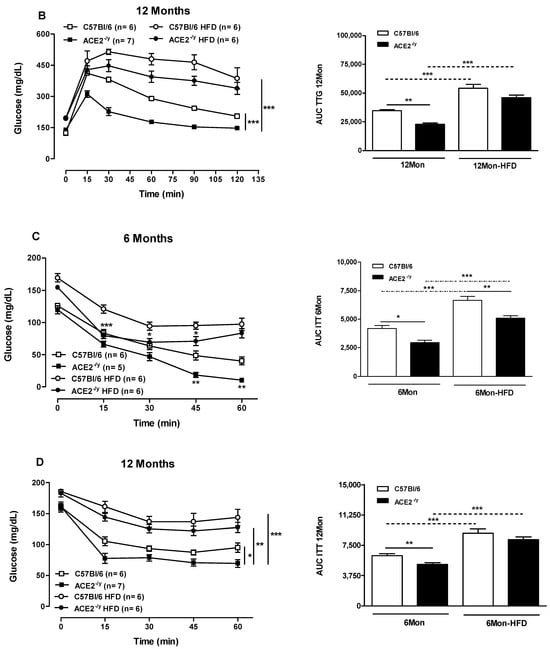 ACE2 deletion increased glucose tolerance at the ages of 6 and 12 months (Figure 3A,B, respectively) and enhanced insulin sensitivity under StD (Figure 3C,D, respectively). Even after HFD, 6-month-old ACE2-/y mice continued to present better glucose tolerance and insulin sensitivity compared to WT mice. Nevertheless, in 12-month-old ACE2-/y mice, these improvements were blunted after HFD.