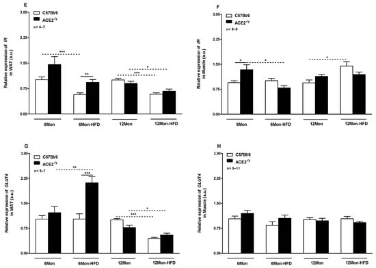 The expression of genes involved in glucose and insulin regulation was measured in WAT and muscle. Under StD, 6-month-old ACE2-/y mice showed augmented levels of insulin receptor (IR) mRNA in both organs, but with statistical significance only in the muscle (Figure 3E,F). However, after HFD, IR expression significantly increased in WAT, but not in the muscle. Meanwhile, 12-month-old ACE2-/y mice showed no difference in IR mRNA in WAT and muscle under StD and HFD (Figure 3E,F, respectively). The levels of glucose transporter type 4 (GLUT4) mRNA in WAT were not different between groups at both ages under StD (Figure 3G). However, such levels were significantly higher in WAT of 6-month-old ACE2-/y after HFD but not in 12-month-old ACE2-/y (Figure 3G). In muscle, no difference in GLUT4 expression was observed between groups (Figure 3H). These results partly explain the better glucose tolerance and insulin sensitivity in 6-month-old ACE2-/y animals, even after HFD ingestion, which was lost in the 12-month-old animals.