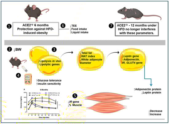 The decrease in fat deposition and adipocyte diameter presented by ACE2-/y, even after HFD, was reflected in the downregulated lipolysis in vivo. Nevertheless, under StD, there was an increase in HSL at 6 months and a reduction in LPL at 12 months. Meanwhile, under HFD, there was an augmentation in adrenergic β3 receptors and in HSL, which are lipolysis stimulators. In that regard, Cai and colleagues [] demonstrated that the infusion of AngII for 2 weeks in C57BL/6 mice induced body and white adipose tissue weight loss by promoting lipolysis by activating the AMPK signaling pathway, which partially explains the results presented by ACE2-/y mice as a function of possible increased AngII levels. Furthermore, it was postulated that catalase activity could be involved in the mechanism, since it has been shown that 3-Amino-1,2,4-Triazole, a catalase inhibitor, induces quick fat loss in mice with high fat-induced metabolic syndrome []. However, the catalase activity in WAT was not altered in ACE2-/y mice in either StD or HFD conditions. Therefore, it is postulated that the marked decrease in adipose tissue deposition in ACE2-/y mice could reflect lipodystrophy, considering that there is a greater uptake of NEFA by the liver [] and, consequently, their lower systemic levels. In this context, in the long term, it was reflected in the decrease in lipolysis due to the decrease in WAT deposition and less size expansion of adipocytes under HFD. WAT stores energy and is considered a complex and dynamic endocrine organ with key metabolic, cardiac, and vascular regulatory functions [,]. A disorder in this tissue triggers reduced production of adipocytokines, such as adiponectin, and upregulation of the expression of leptin, tumor necrosis factor-α (TNF-α), and interleukin-6 (IL-6), promoting insulin resistance in association with increased visceral adiposity [,]. Systemic adiponectin levels are inversely correlated with the amount of WAT, and the opposite is observed for leptin levels []. This is consistent with the observation that the lower WAT index presented by ACE2-/y resulted in an increase in adiponectin and decrease in leptin levels in plasma, even after HFD consumption at 6 months of age. Among its several biological functions, adiponectin plays an anti-inflammatory and insulin sensitizing role []. Meanwhile, in knockout mice, adenoviral adiponectin overproduction ameliorates diet-induced insulin resistance []. Additionally, Combs et al. [] identified a dominant mutation in the collagenous domain of this adipocytokine that elevated its circulating levels in mice and also improves insulin sensitivity []. In the present work, the increase in systemic levels of this hormone in ACE2-/y mice contributed to a better insulin sensitivity and glucose tolerance profile, even concomitantly with HFD consumption. Contributing to this favorable glycemic profile, ACE2-/y mice presented higher expression of IR in the muscle under StD, and of IR and GLUT4 in WAT under HFD. It is important to highlight that after 60 min of the intraperitoneal application of insulin in 6-month-old ACE2-/y mice during the test, insulin sensitivity was so intense that glucose reached extremely low levels and, to avoid hypoglycemic shock, glucose (5% in saline, 10 µL·g−1·BW−1) was applied subcutaneously at the end of the experiment. Taken together, these data suggest a greater uptake of glucose in these important metabolic organs.