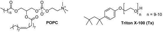 Chemical structures of POPC and of Triton X-100. POPC is a pure phospholipid, fluid at room temperature (Tm = −2 °C), and Triton X100 (Tx) is an amphiphile that has well-defined physicochemical properties and a low CMC of 0.3 mM, which facilitates the formation of supramolecular structures, including mixed micelles with natural phospholipids, such as POPC and congeners.