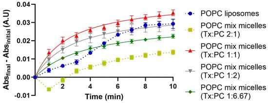 POPC is also suitable for forming mixed micelles, as it can be readily mixed with amphiphiles such as Triton X-100, forming these types of supramolecular assemblies [,]. Triton X-100 is a nonionic surfactant with well-defined physicochemical properties (Figure 1) []. It has a hydrophilic polyethylene oxide chain (9–10 units in length) attached to a 4-(1,1,3,3-tetramethylbutyl)-phenyl hydrophobic group, with a molecular weight Mn ~625 g/mol. Due to its nonionic nature and low packing parameter, Triton X-100 (Tx) has been used as a common surfactant in micellar formulations. It does not introduce any charged species into the assay system and has a low critical micellar concentration (CMC) of 0.3 mM, which helps in forming micellar structures at a relatively lower concentration [,,]. Oppositely, anionic amphiphiles used in PLA2 assays such as deoxycholate have high CMC (2 mM), interact with Ca2+ ions in the assay buffer, and have an effect on the pH and the ionic strength of the buffer system []. For Tx/POPC mixed micelles, we have selected molar ratios of Tx:POPC of 2:1, 1:1, 1:2, and 1:6.67 molar ratios because at higher Tx:POPC molar ratios, an apparent inhibition of the enzyme was reported, attributed to a surface dilution effect, [] and at lower molar ratios, the mixed micelles were no longer stable and unimodal [].