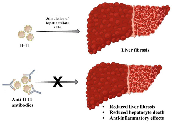 | Increased levels of IL-11 | Anti IL-11 antibodies | Reduced fibrosis, anti-inflammatory effect, reduced hepatocyte death |