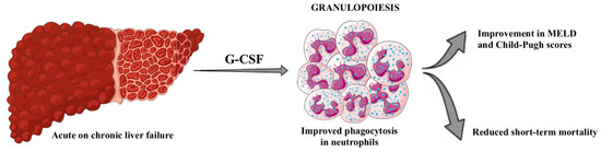 | Impaired neutrophil phagocytosis, chemotaxis, superoxide production, and attenuated degranulation | G-CSF | Improvement in Child–Pugh and MELD scores reduced short-term mortality |