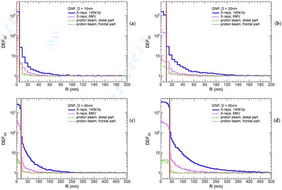 The most prominent dose enhancement is observed for 140 kVp X-rays. Thus, the dose enhancement factor in the first 5 nm shell outside of the GNP increases with its size from ≈ to ≈, whereas it falls down close to unity at distances of 80 nm, 150 nm, 250 nm, and 450 nm for GNPs with sizes of 10 nm, 20 nm, 40 nm, and 80 nm, respectively. The shape of profiles for 6 MV X-Rays are close 140 kVp X-rays; however, the values of s are one order lower compared to 140 kVp X-rays, and dose enhancement zones are nearly two times smaller for all GNP sizes. The dose enhancement factor for proton beam is ≈2 in the first 5 nm shell outside of a GNP, whereas it is negligible further away from the GNP surface.
