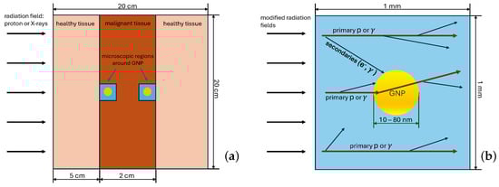 A schematic (not to scale) layout of the simulated system: (a) The macroscopic setup represents a cube consisting of human soft tissue. The dark orange layer represents a tumor, the smaller blue cubes represent the microscopic volume with a gold nanoparticle inside, either on frontal or distal parts of the tumor layer. (b) A close-up of a microscopic volume represents a water cube with gold nanoparticles of various (10 to 80 nm) radii inside. The thick dark red arrows denote the primary beam particles, and the thin black arrows indicate the secondary particles that can interact with the GNP as well.