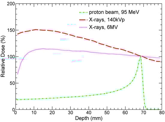 The system is irradiated with a uniform flux of photons or protons. The energy spectra of the incoming beam particles are chosen so that they would be close to realistic RT scenarios. Namely, we study an irradiation by X-rays with a 140 kVp spectrum [], 6 MV photon beam [], and a proton beam with an energy of 95 MeV. The chosen X-ray spectra are typical for modern CT and XRT machines. The energy of the protons is adjusted so that Bragg peak is close to the distal part of the tumor layer that is demonstrated in Figure 3, which shows the relative dose versus depth in tissue for both protons and X-rays. It is instructive to note that the doses deposited by both kilovoltage and megavoltage X-ray beams monotonically decrease from a depth of ≈10 mm, and are undesirably high outside of the tumor slice.