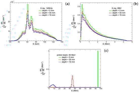 Energy distribution of 140 kVp (a), 6 MV (b), and photons and protons (c) at different depths in tissue. These distributions are normalized by the number of initial beam photons () and protons ().